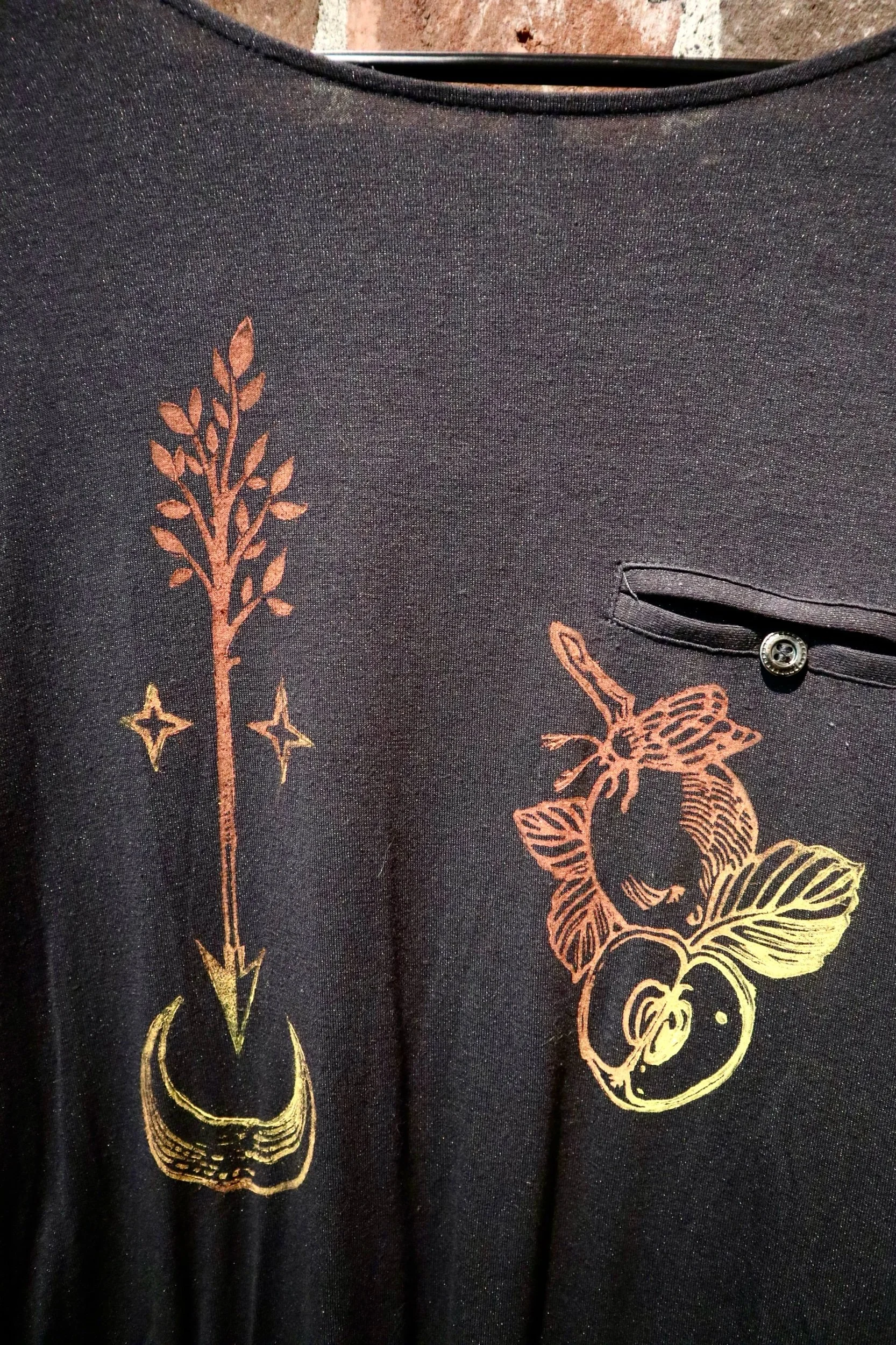 Custom Lino printed clothing by Armony & Dwam! 3/4 Sleeve black shirt with apples & arrow designs (+ buttons up the back!) - size XSmall $35 - Hand wash only.